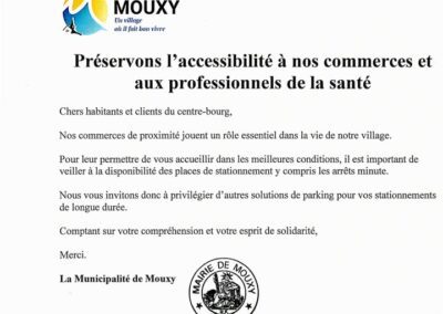 - Un flyer a été édité pour sensibiliser chacun à laisser un maximum de places libres à proximité des commerces et cabinets médicaux, afin de faciliter l’accès aux clients et patients.
